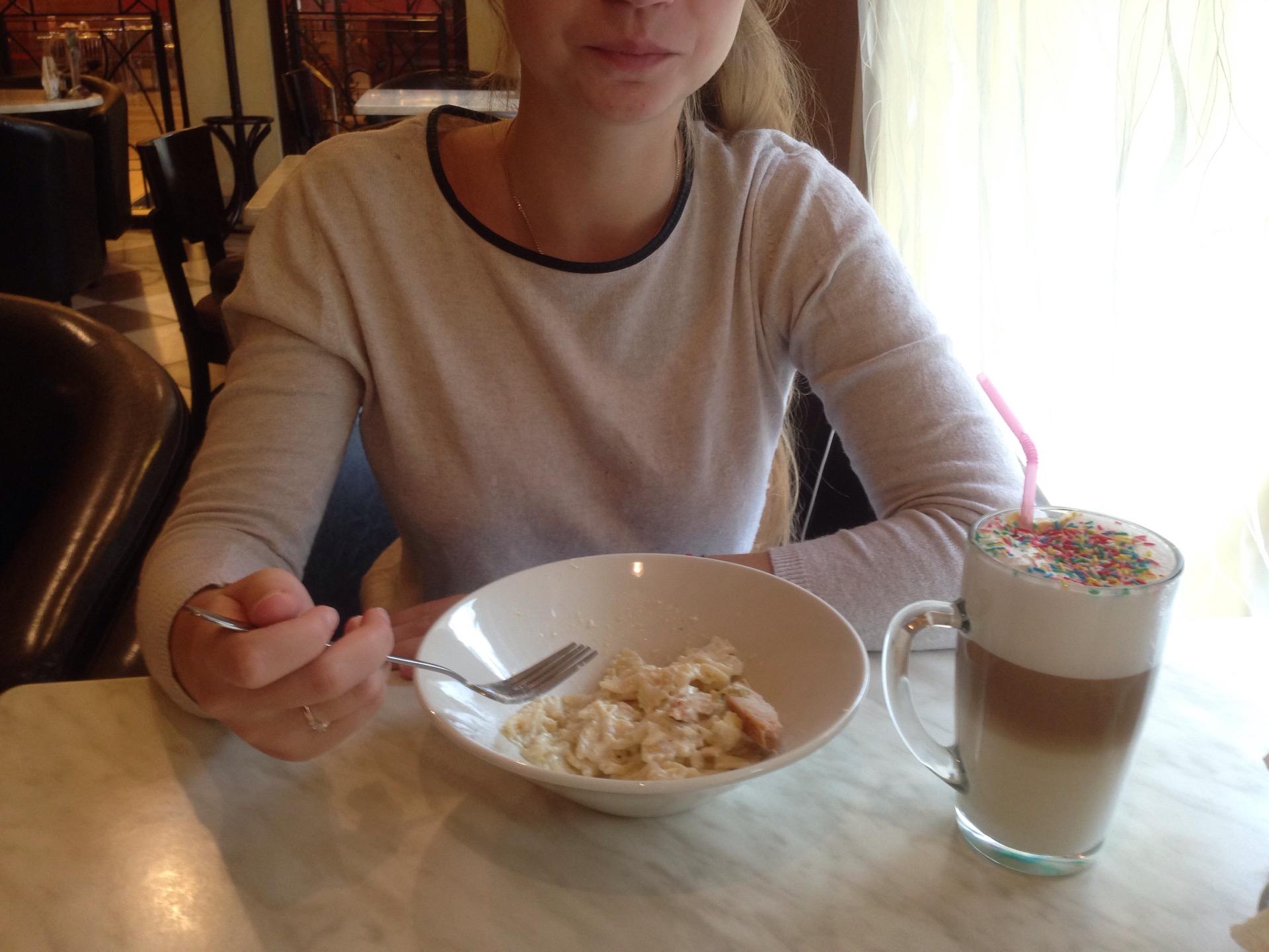 Карбонара в ланче - не карбонара и будто оформлена заранее, чтобы осталось только разогреть. Кофе вкусный, муравейник тоже, но вилкой его есть невозможно - оочень плотный. Десерты у них вкусные.)
